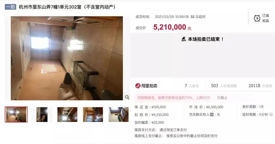 3月5日10时56分,阿里法拍平台上,一套位于杭州里东山弄的法拍房落锤成交,成为新政后排名前列套成交的法拍房。
