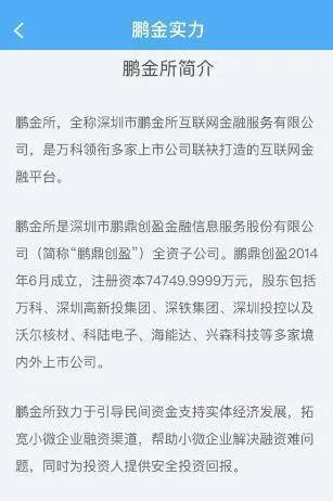 在鹏金所App的简介中就写道:“鹏金所是万科领衔多家上市公司联袂打造的互联网金融平台。股东包括万科、深圳高新投集团、深铁集团、深圳投控以及沃尔核材、科陆电子、海能达、兴森科技等多家境内外上市公司。”