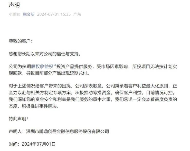 7月1日,鹏金所在其微信公众号上发布《声明》称,公司为多期股权收益权投资产品提供服务,受市场因素影响,所投项目无法按计划实现回款,导致目前部分产品出现延期兑付。