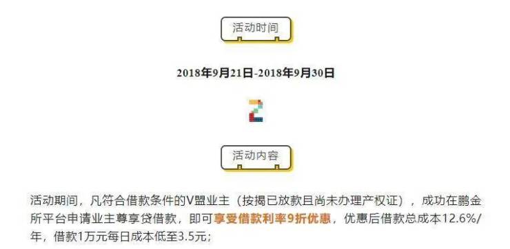 “鹏金所微刊”2018年还曾发布信息:“鹏金所携手万科,为北方区域10大城市的万科新业主提供业主贷专属优惠活动。凡符合借款条件的业主,成功在鹏金所平台申请业主尊享贷借款,即可享受借款利率9折优惠,优惠后借款总成本12.6%/年,借款1万元每日成本低至3.5元。”
