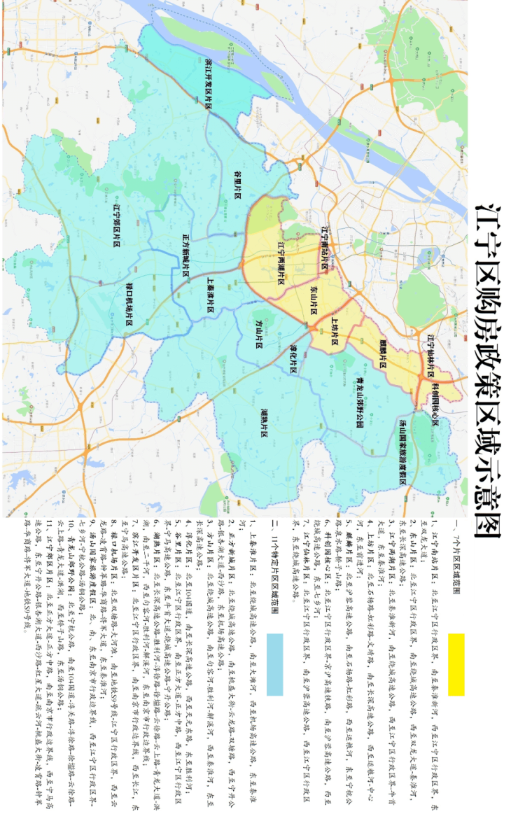 江宁郊区片区:北至正方大道-正方中路,南至南京市行政边界线,西至宁马高速公路,东至宁丹公路-银杏湖大道-西沙路-红星大道-疏云河-桃盛大街-凌霄路-钟萃路-华商路-将军大道-地铁S9号线。
