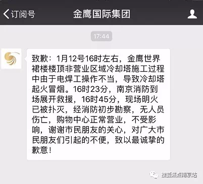 金鹰也发布致歉声明,由于裙楼楼顶非营业区域冷却塔施工过程中由于电焊工操作不当,导致冷却塔起火冒烟,目前购物中心正常营业,不受影响。