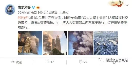 南京交警发布微博称:因河西金鹰世界有火情,目前云锦路的应天大街至集庆门大街段临时交通管控,请服从交警指挥。另,应天大街高架西向东车多缓行,过往车辆请提前绕行。