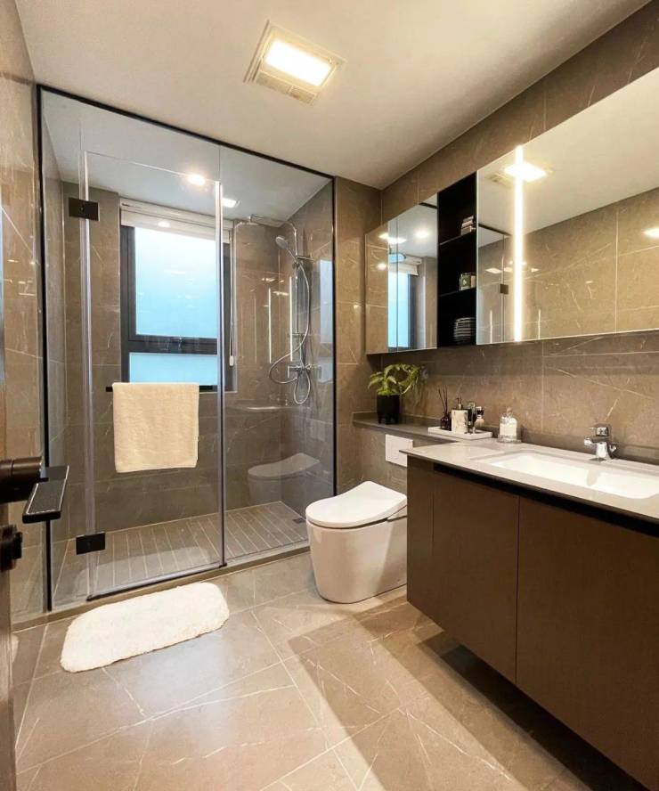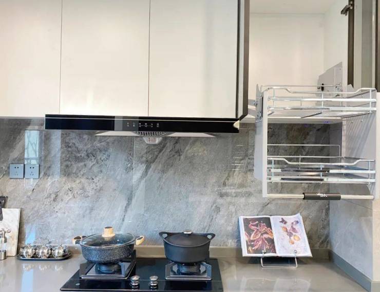 厨电采用美国GE品牌油烟机+灶具+蒸烤一体机,配备弗兰卡水龙头,细节也没有放过,灶具一侧采用整块陶瓷抗污板,方便后期打理,还配有天使拉篮。(以开发商最终交付为准)