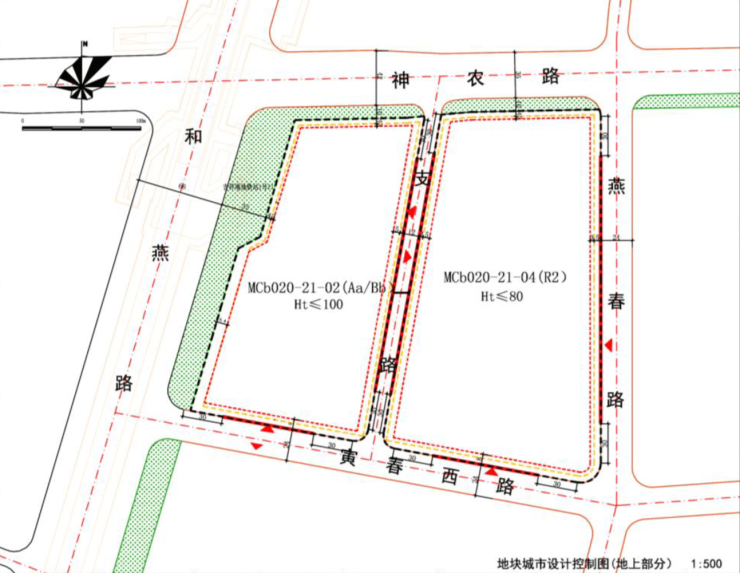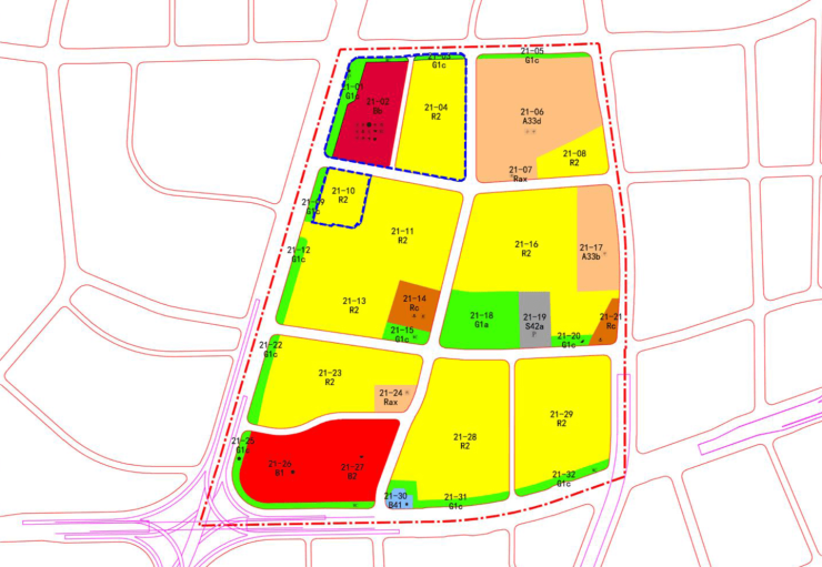 (二) 将原 21-02、03、04 地块合并,合并后在地块中间新增一条南北向规划支路,道路红线宽度 12 米; 新增规划支路西侧地块规划用地性质为商办混合用地 (Bb),用地编号为 21-02,容积率<4.5, 建筑密度<55%,建筑高度<100米,绿地率>15%,复合建设总建筑面积不少于 21540 平方米的居住社区中心和不少于 200 辆机动车、300 辆非机动车的社会停车场: 新增规划支路东侧地块规划用地性质为二类居住用地(R2),用地编号为 21-04,容积率≤2.6,建筑密度≤25%,建筑高度≤80 米,绿地率>30%。