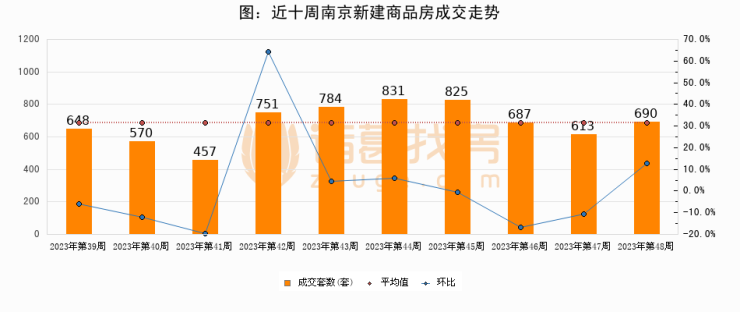 进入2023年第48周(11月20日-11月26日),南京新建商品房成交690套,较上周增加77套,环比上涨12.6%