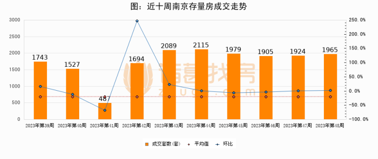 存量房方面,第48周南京存量房成交1965套,较上周增加41套,环比上涨2.1%。从近十周成交走势来看,周均成交套数为1742套,本周高于平均水平12.8%。