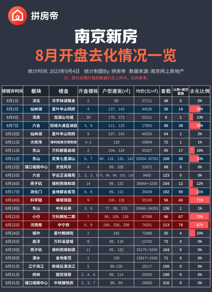 比如仙林湖的星叶半山玥府,8月连续两次开盘,目前仅上传了15套数据,项目自7月首开至今共推出154套房源,目前未售还有104套,去化仅3成多。