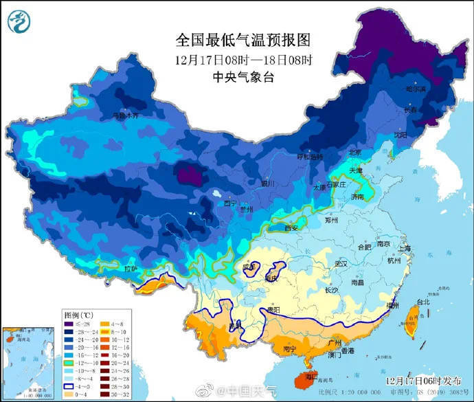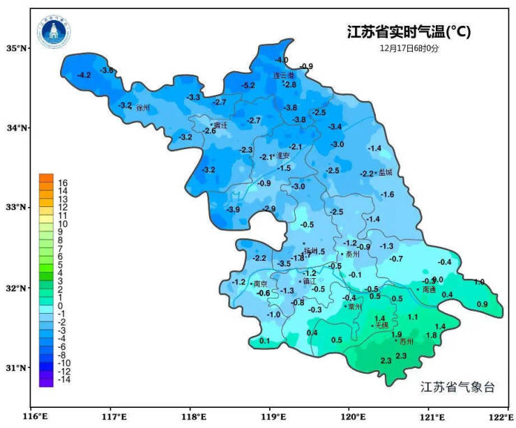12月18日20时至12月19日20时,全省晴到多云。最高温度:沿江和苏南地区8~9℃,其他地区6~7℃;最低温度:全省-4℃左右,全省大部分地区有冰冻。全省偏南风3-4级。