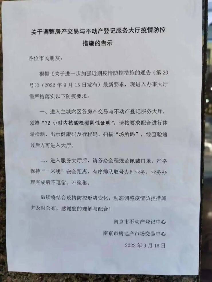 南京市房地产市场交易中心和不动产登记中心发布告示,根据《关于进一步加强近期疫情防控措施的通告(第20号)》(2022年9月15日发布)较新要求,现进入办事大厅需严格落实以下防疫要求: