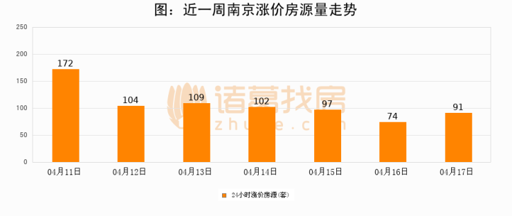 根据诸葛找房数据显示,南京24小时涨价房源量为91套,较04月16日增加17套,环比上涨23%。与此同时,涨价房源占比小幅扩大,业主信心有所提升。