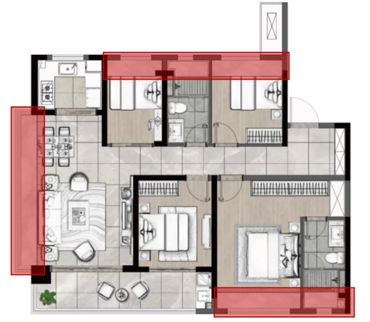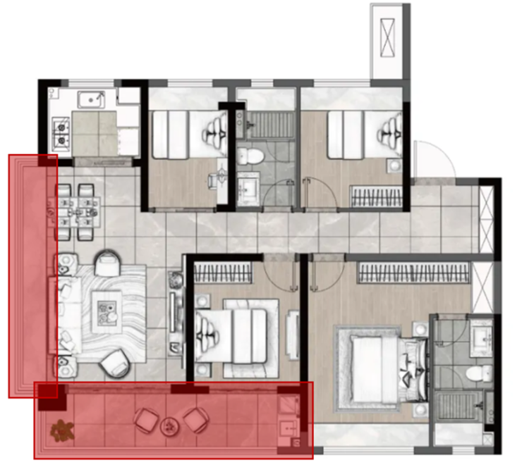 这款户型的内卷程度,真的给其他开发商很大压力,短期内很难有超越越江时代约128㎡边户这样既有创先精神又不乏实用性的户型。上一次看到这样令人惊叹的产品,恐怕还是上海、杭州、深圳那些江景豪宅。但仔细观察就不难发现,这些大多都是狭长型的边户设计,面宽很小,南北面的采光和通风会受到一定影响。
