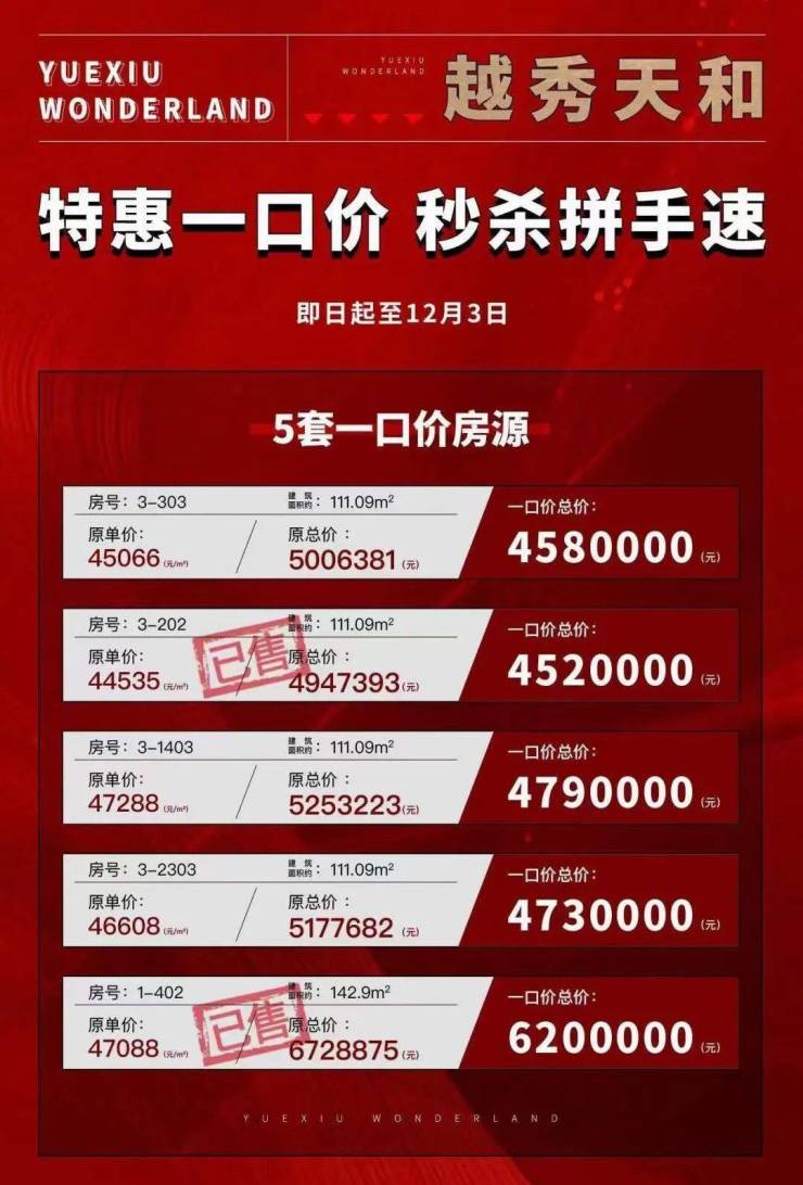 小行的越秀天和拿出5套房源做特惠一口价,4套建面约110㎡、1套建面约143㎡。其中最高优惠达52.8万!