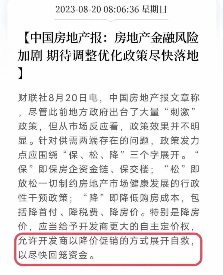 8月20日,中国房地产报发布《房地产金融风险加剧期待调整优化政策尽快落地》,其中提到:救市政策发力点应围绕“保、松、降”三个字展开,其中“降”包含降低购房成本,包含降首付、降税费、降房价。