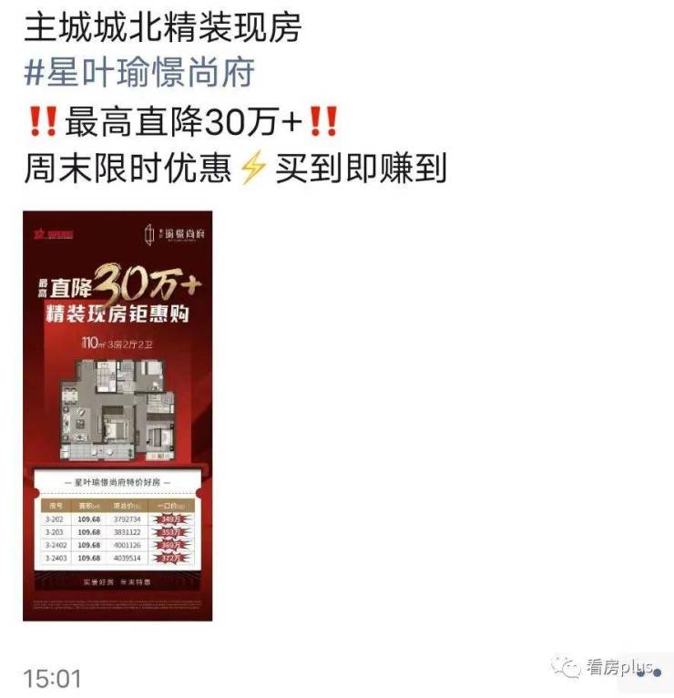 溧水的金地峯范花园直接推出3套特价房,单价10500元/㎡起。而项目此前销许均价约15817元/㎡,按照这个价格算下来,特价房直接给到了66折!