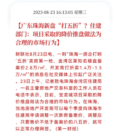 8月22日广东珠海一新盘,打响“五折卖房”第一枪,当地住建部门就表示:为合理的市场行为。