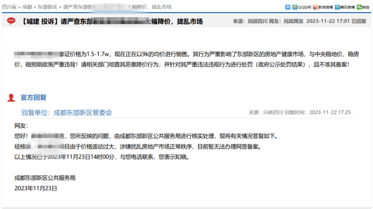 随后,官方回复:网友所反映的问题,已由成都东部新区公共服务局进行核实处理。经核实,项目价格波动过大,涉嫌扰乱房地产市场正常秩序,目前暂无法办理网签备案。