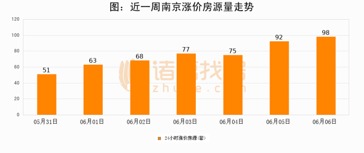 根据诸葛找房数据显示,南京24小时涨价房源量为98套,较06月05日增加6套,环比上涨6.5%。与此同时,涨价房源占比小幅扩大,业主信心有所提升。