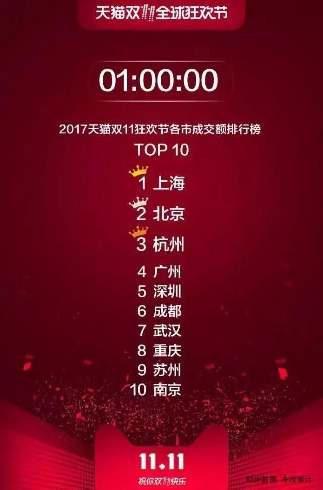 今天,天猫双11的成交金额榜单数据新鲜出炉,上海、北京、杭州揽获前三名,南京位居第十位。