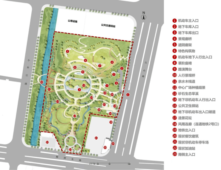 本项目位于江北新区柳洲东路与江山大街西北角,紧邻柳洲东路地铁站,项目占地面积约4.94公顷,总建筑面积约13000㎡,规划地下配建P+R停车场(驻车换乘停车场),将以私家车停放在地铁站P+R停车场后换乘地铁出行的模式,优化出行效率。在公共交通为导向的发展模式指导下,本项目统筹协调公园地上地下空间的整体设计,着力打造P+R地下停车场、地铁进出站换乘空间、生态景观休憩空间等多功能融合为一体的复合型城市公园。附近居民既能在早晚高峰时段实现无缝便捷换乘,又能在平峰时段体验公园游憩慢生活。