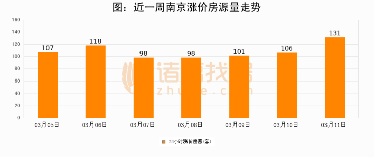 根据诸葛找房数据显示,南京24小时涨价房源量为131套,较03月10日增加25套,环比上涨23.6%。与此同时,涨价房源占比小幅扩大,业主信心有所提升。