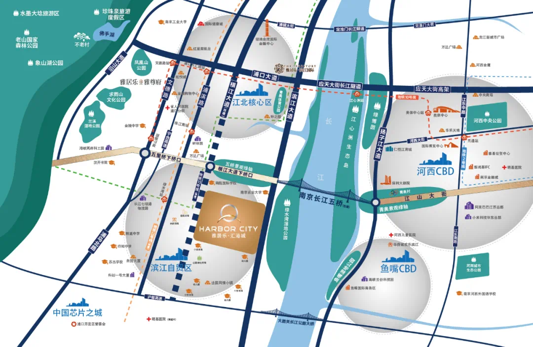 随着长江五桥(南京江心洲长江大桥)的正式通车,南京拥江发展形成优质闭环,雅居乐汇港城距离五桥江北的排名前列下桥口——横江大道下桥口仅约3公里,不仅能率先承接两岸利好,更是河西商业发展轴与江北商业发展轴交汇之地。