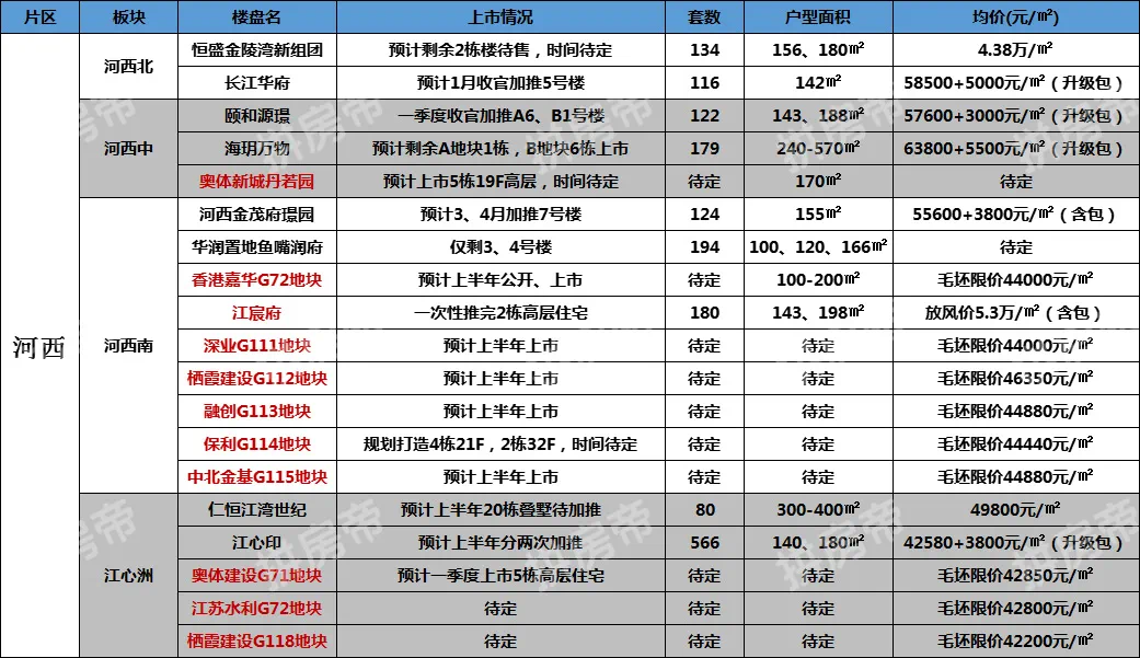 河西南纯新盘香港嘉华G72和江宸府预计较先上市。香港嘉华G72预计2、3月公开售楼处,项目毛坯限价4.4万/㎡,加上装修包上市价格预计5万/㎡左右。