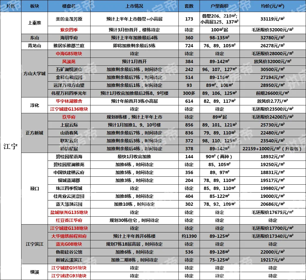 上半年,江宁有超30盘计划上市,其中比较热门的上秦淮、方山都将迎来纯新盘。供应量较大的仍然在刚需板块,如正方新城、禄口以及江宁滨江。