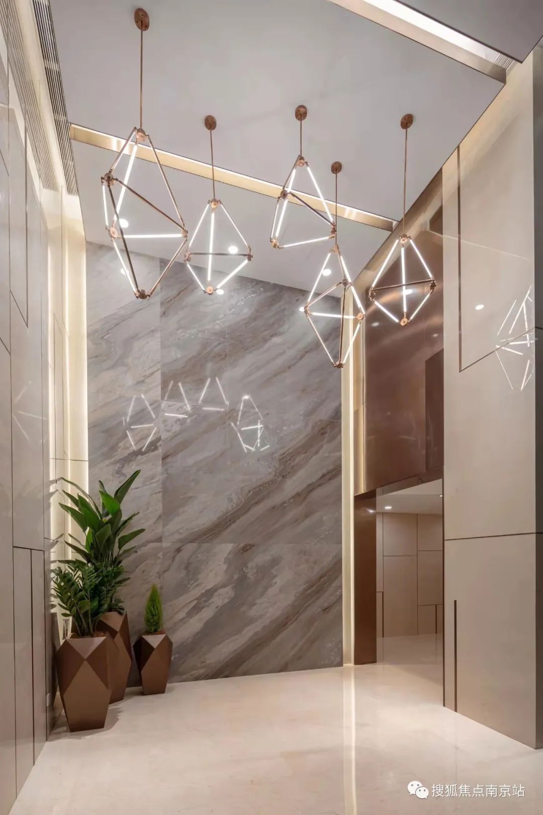 PART04.细节用心!大堂、车库实景呈现除了外立面,项目内部所呈现出的实景同样让人惊艳!虽然整个项目仅有2栋住宅,但社区大堂、景观打造都绝不含糊。项目采用了地下、地上双大堂设计,首层入户采用约5.2米挑高设计,背景墙面大面积采用灰色系大理石和金属线条铺设,同时配以装饰灯具,奢华感十足!