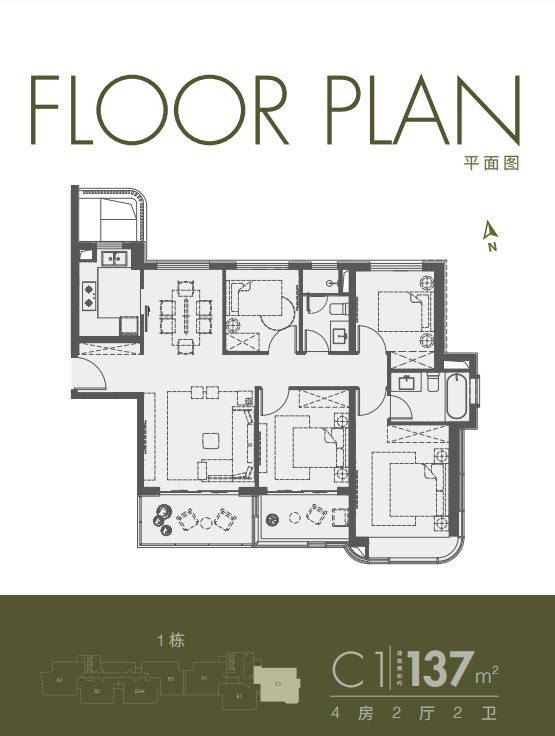 137㎡四房两厅两卫户型,南北通透,三开间朝南,四房的设计增加户型的功能性。动静分离设计,活动区域、休息区域动线基本无重合;朝南双阳台+主卧弧形飘窗,进一步增加室内采光效果。