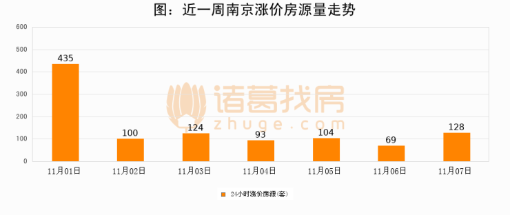 根据诸葛找房数据显示,南京24小时涨价房源量为128套,较11月06日增加59套,环比上涨85.5%。与此同时,涨价房源占比小幅扩大,业主信心有所提升。