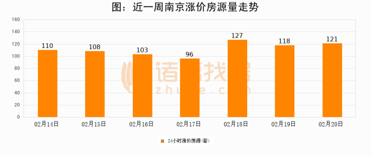 根据诸葛找房数据显示,南京24小时涨价房源量为121套,较02月19日增加3套,环比上涨2.5%。与此同时,涨价房源占比小幅扩大,业主信心有所提升。