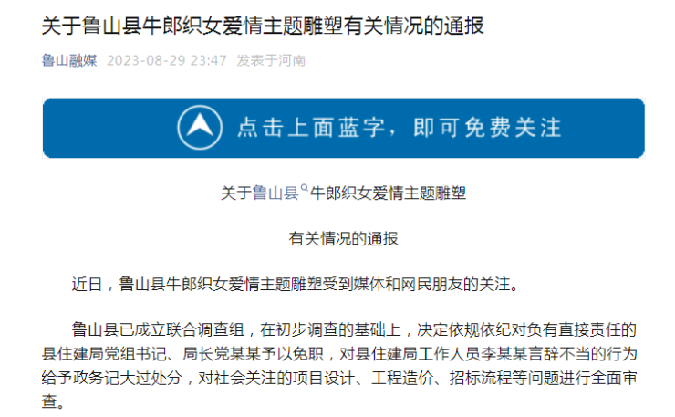 据鲁山融媒29晚近24时消息,鲁山县联合调查组发布关于鲁山县牛郎织女爱情主题雕塑有关情况的通报。