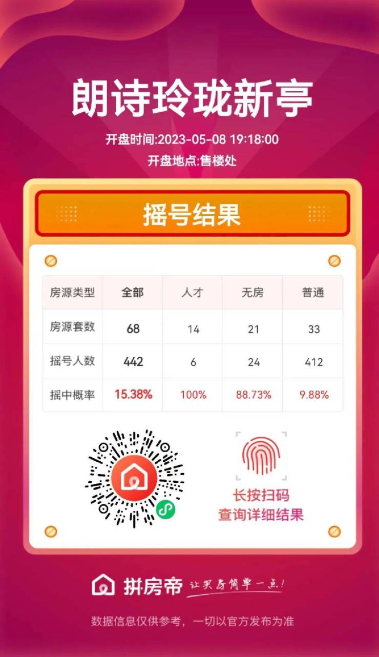 值得一提的是,本次项目首开仅有68套房源,共计442组买房人报名,综合中签率仅15.38%,相当于平均7人抢1套!