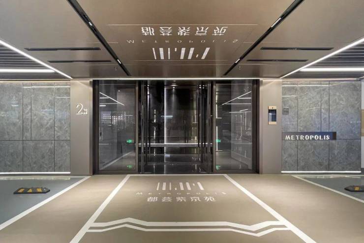 酒店式精装双入户大堂,仪式感拉满!首层入户大堂,大门采用竖纹仿石砖+金属全包设计,满满的高级感。