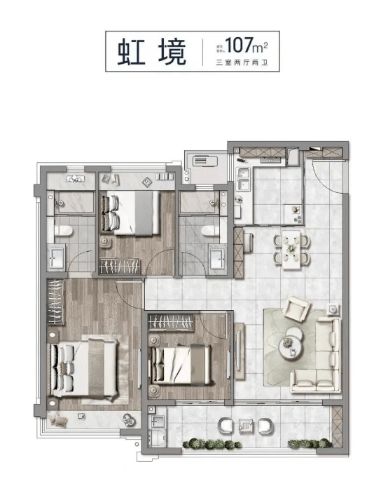 项目主力在售的107平户型,空间感更是逼近市面上近120㎡户型的效果。