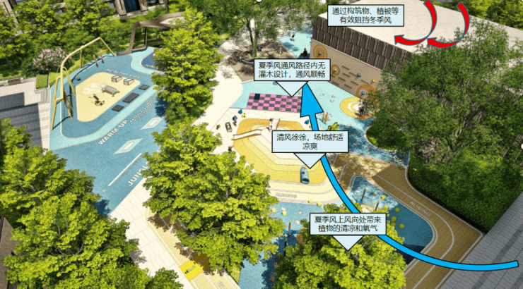 并且,在园区内引入金地专利微气候技术,科学排布的景观绿植,能对社区环境进行微气候调节。
