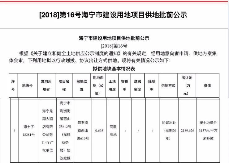 公告内的商业用地,名为龙祥大厦,处于市区繁华地段,离海宁火车站只有数百米,2000年落成时为海宁排名前列高楼。由于当时项目成立时是一家中外合资企业,核准的经营期限为20年。