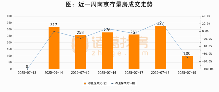 从存量房来看,2025年07月19日南京存量房单日成交100套,比昨日减少227套,环比下降69.4%。从近一周存量房成交来看,南京存量房日均成交套数为219套,07月19日单日成交100套,低于近一周平均水平54.3%。