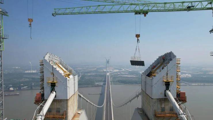 目前,仙新路过江通道各项建设任务正按照既定节点全力冲刺,钢鞍罩顺利安装完成为项目建成具备通车条件奠定了坚实基础,后续将开展钢鞍罩附属结构安装和塔顶平台拆除等工作。