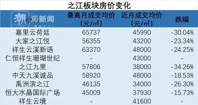 潮新闻美好生活研究院的数据显示,之江板块目前在售二手房近月成交均价,与之前最高月成交均价相比,平均跌幅都在20%以上,最高的甚至跌幅达到34%。而之前最高月成交均价达到过65737元/㎡的嘉里云荷廷,最近成交均价也只能达到46000元/㎡左右。
