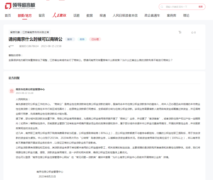 近日,有网友通过网络问政,询问南京房贷商转公能否实现的问题。