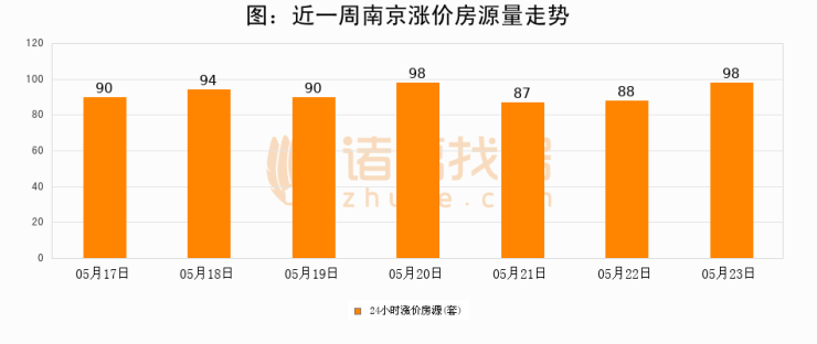 根据诸葛找房数据显示,南京24小时涨价房源量为98套,较05月22日增加10套,环比上涨11.4%。与此同时,涨价房源占比小幅扩大,业主信心有所提升。