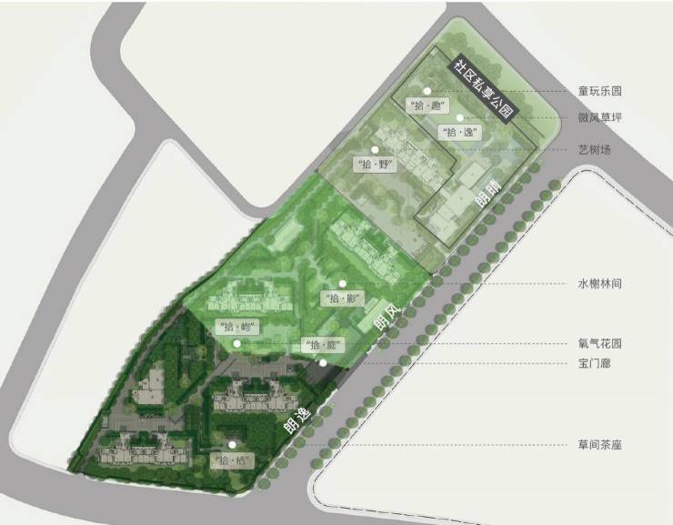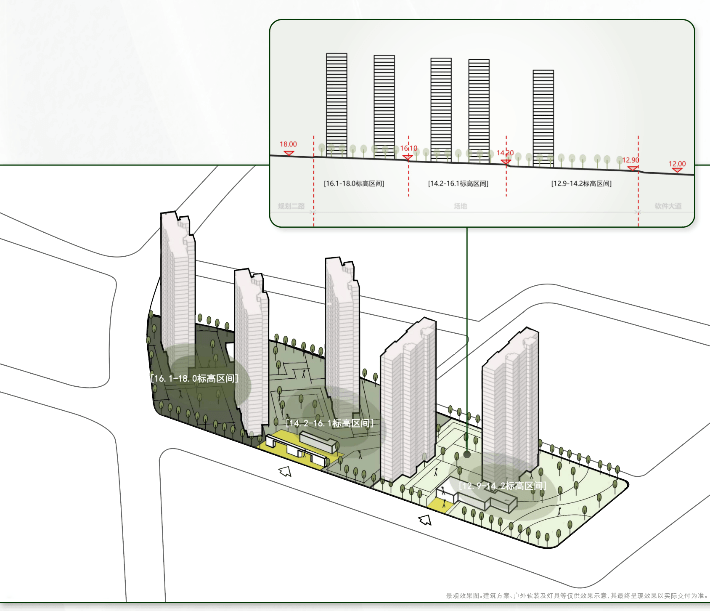 项目领地内三重地形高差,形成多样气质的度假式生活场域“天朗拾境”,这里将以“立体、复合、交错”的概念打造都市岛屿:丰富的铺装,岛屿状的台地绿化,打造社区生态空间,引导驻足、休憩与互动。以拾阶而上的景观序列呈现,带来更多山林府邸才有的自然生活体验。