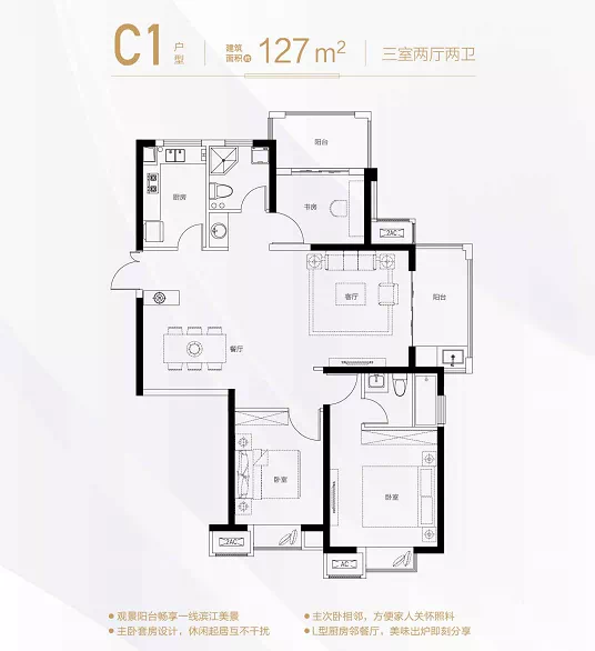 建面约127㎡户型:三室两厅两卫设计,南北通透格局,三面采光,尽纳阳光清风。大横厅衔接东向阳台,形成通透大开间,宽敞大气。双卧室朝南,且均带独立飘窗,其中主卧套房设计,带独立卫浴。