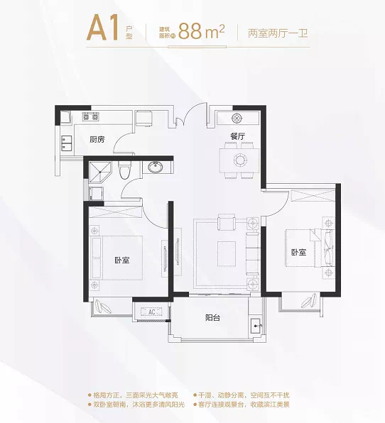 建面约88㎡户型:两室两厅一卫设计,经典两室,功能齐全,属经济型户型功能房间。格局方正,三面采光大气敞亮;干湿、动静分离,空间互不干扰;双卧室朝南,沐浴更多清风阳光;客厅连接观景阳台,收藏滨江美景。