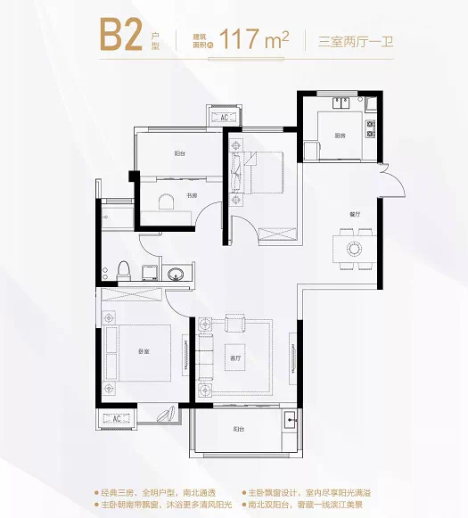 建面约117㎡户型:三室两厅一卫,经典三房设计,全明户型,南北通透。餐厅厨房一体,罕见南北双阳台配置,南向主卧带独立飘窗。