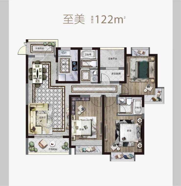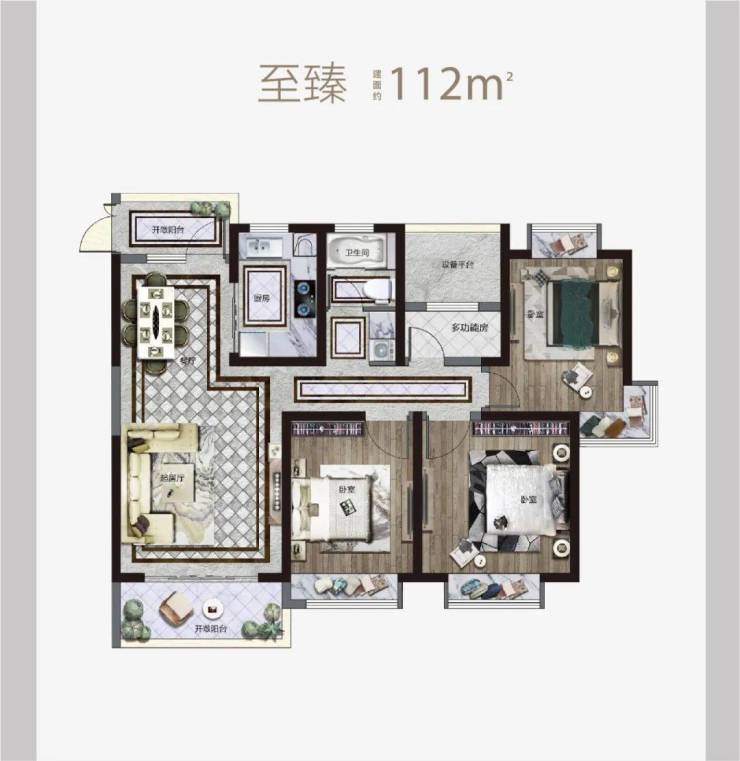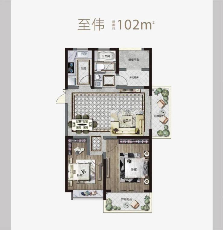 建面约102㎡以上户型享双阳台,卧室全飘窗,可赏内外双景。同时还预留了多功能空间,构建舒朗有序的理想生活。
