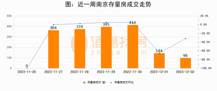 从存量房来看,2023年12月02日南京存量房单日成交98套,比昨日减少46套,环比下降31.9%。从近一周存量房成交来看,南京存量房日均成交套数为255套,12月02日单日成交98套,低于近一周平均水平61.6%。