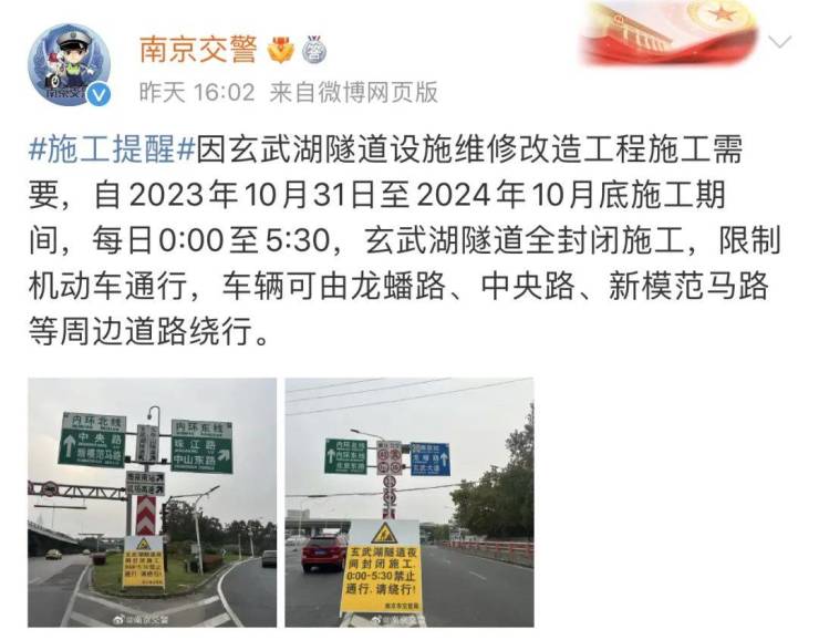 “南京交警”官方微博发布 因玄武湖隧道设施维修改造工程施工需要,自2023年10月31日至2024年10月底施工期间,每日0:00至5:30,玄武湖隧道全封闭施工,限制机动车通行,车辆可由龙蟠路、中央路、新模…